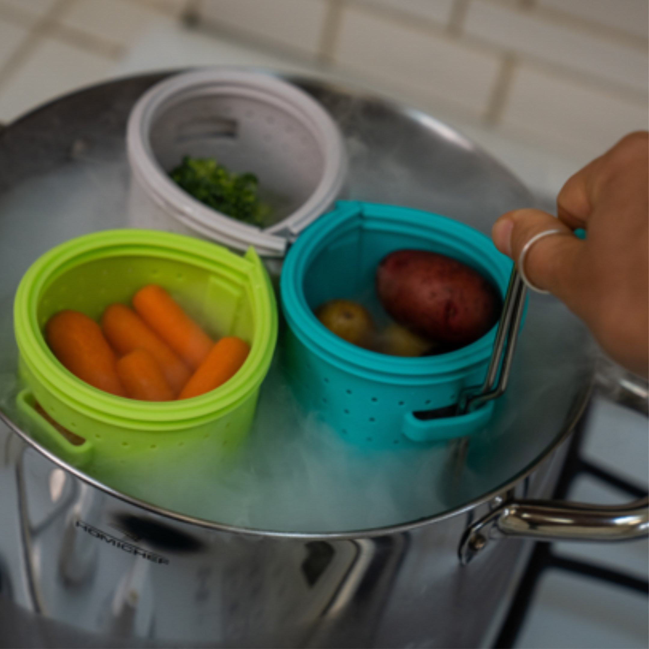 Meet Nutri-Steamer - the perfect solution for creating flavorful, nutritious dishes in less time when utilizing 3 Nutri-Steamers. Its versatile design fits into a 6-quart or larger pot, allowing you to cook multiple dishes at once while preserving nutrition and taste.